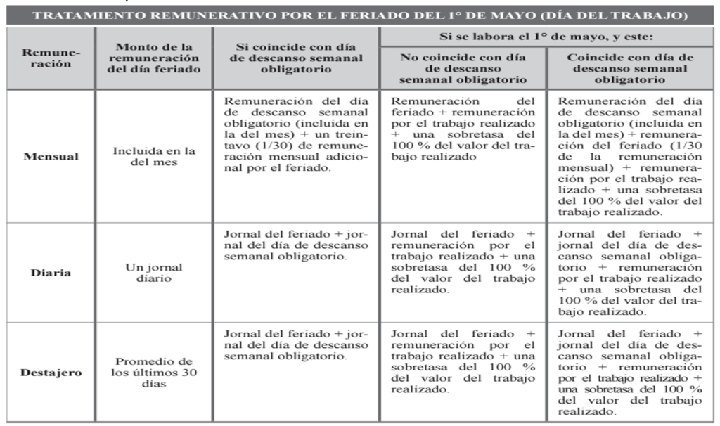 - No se «funde» con el descanso semanal: En otros feriados, si la fecha coincide con el descanso semanal obligatorio (DSO), ambos se fusionan en un solo pago. Sin embargo, si el 1 de mayo coincide con el DSO, se pagan ambos conceptos de forma separada, incluso si el trabajador no labora ese día.